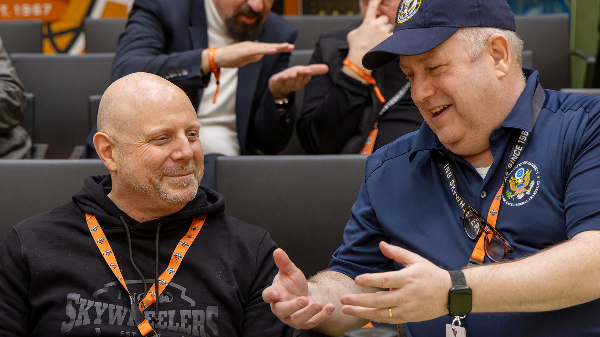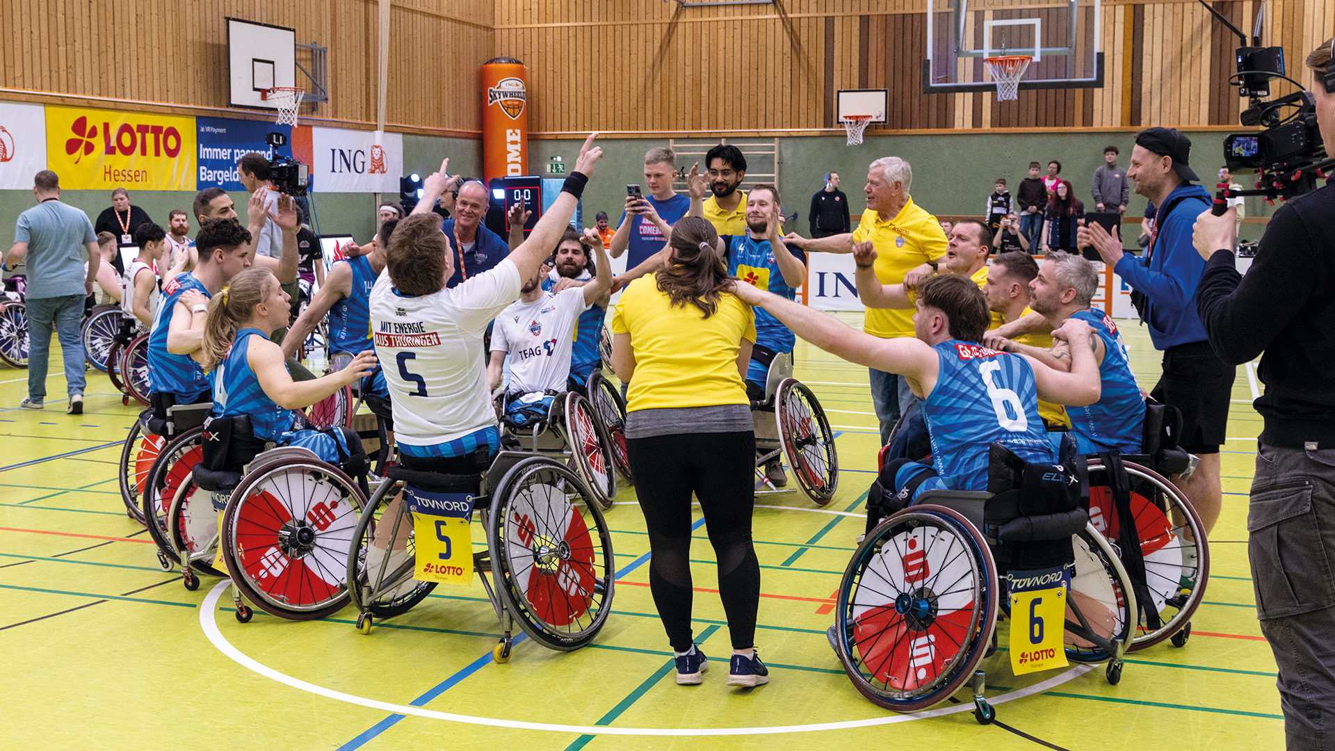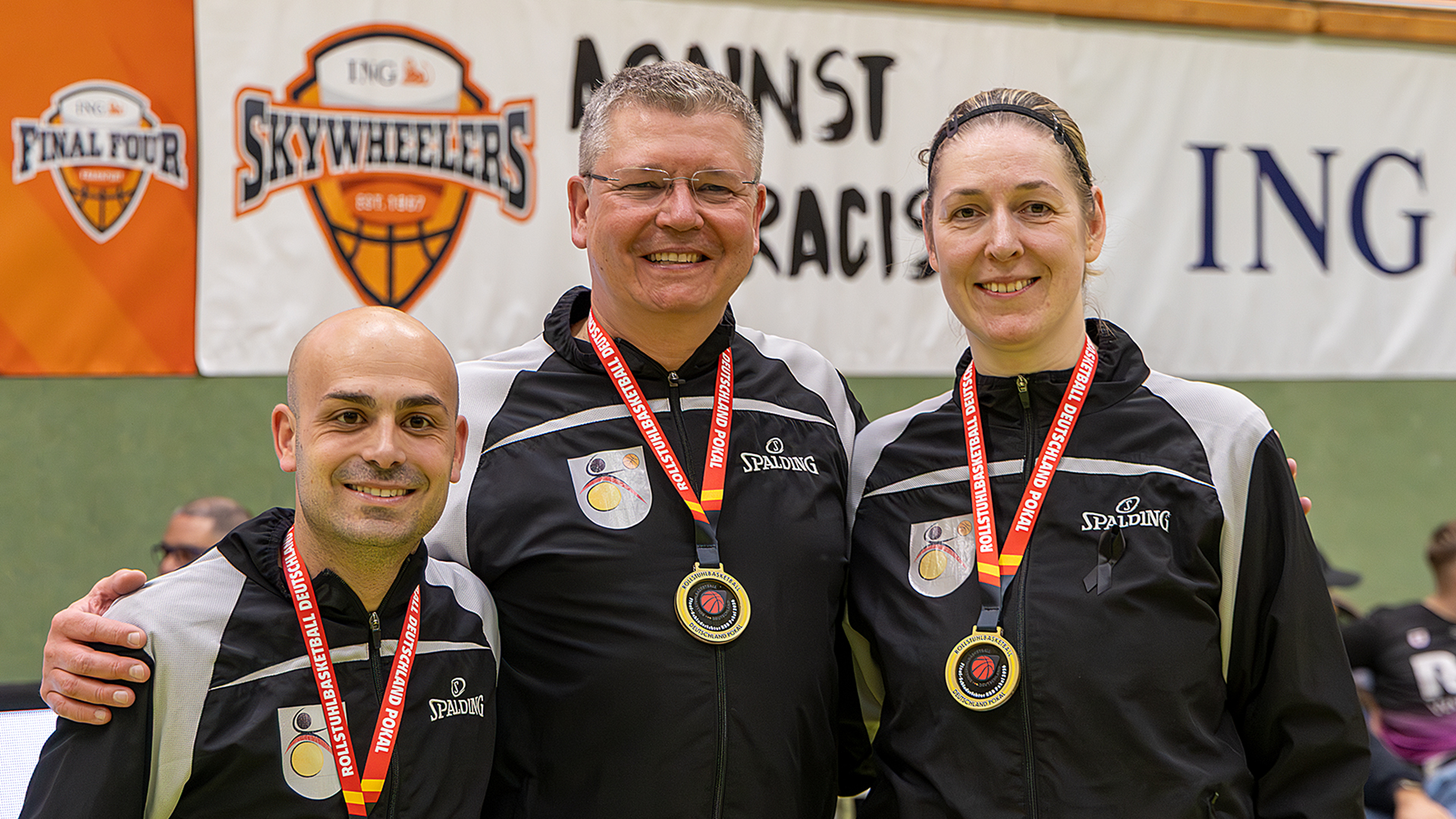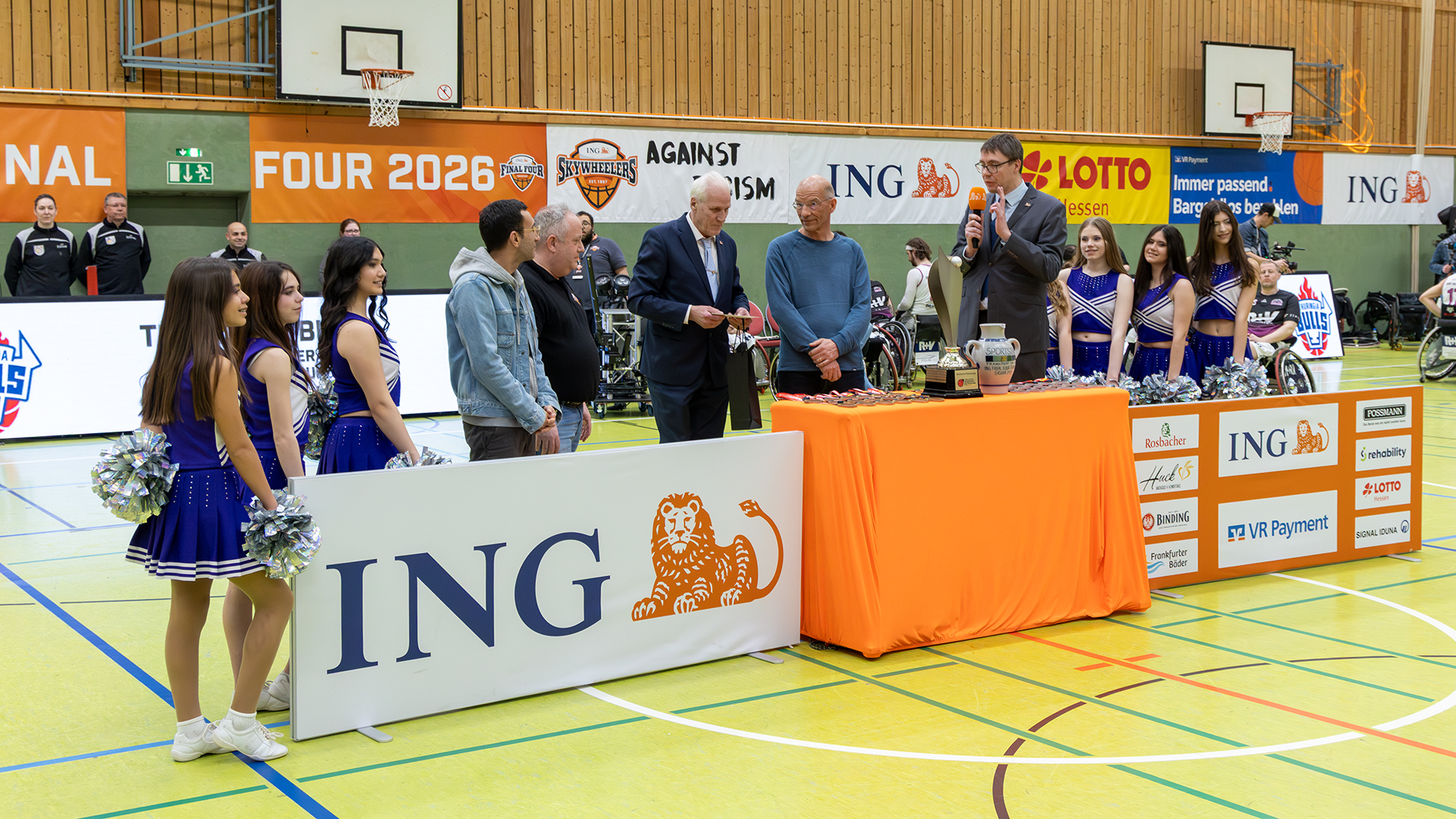 Ein großes Dankeschön richteten Pokal-Spielleiter Jürgen Bäumer (2. v. l.) und Sportvorstand Marcus Jach (2. v. r.) vom Fachbereich Rollstuhlbasktball vor der Siegerehrung an Pierre Fontaine (m.) und sein Orgateam von den ING Skywheelers für die hervorragende Ausrichtung des Final Four. Folgerichtig haben die Verantwortlichen entschieden, dass der Standort Frankfurt nach 2027 weitere fünf Jahre Austragungsort dieses prestigeträchtigen Wettbewerbs bleiben wird. Darüber freuten sich auch Frankfurts Oberbürgermeister Mike Josef (l.) und Stadtkämmerer Dr. Bastian Bergerhoff (r.).