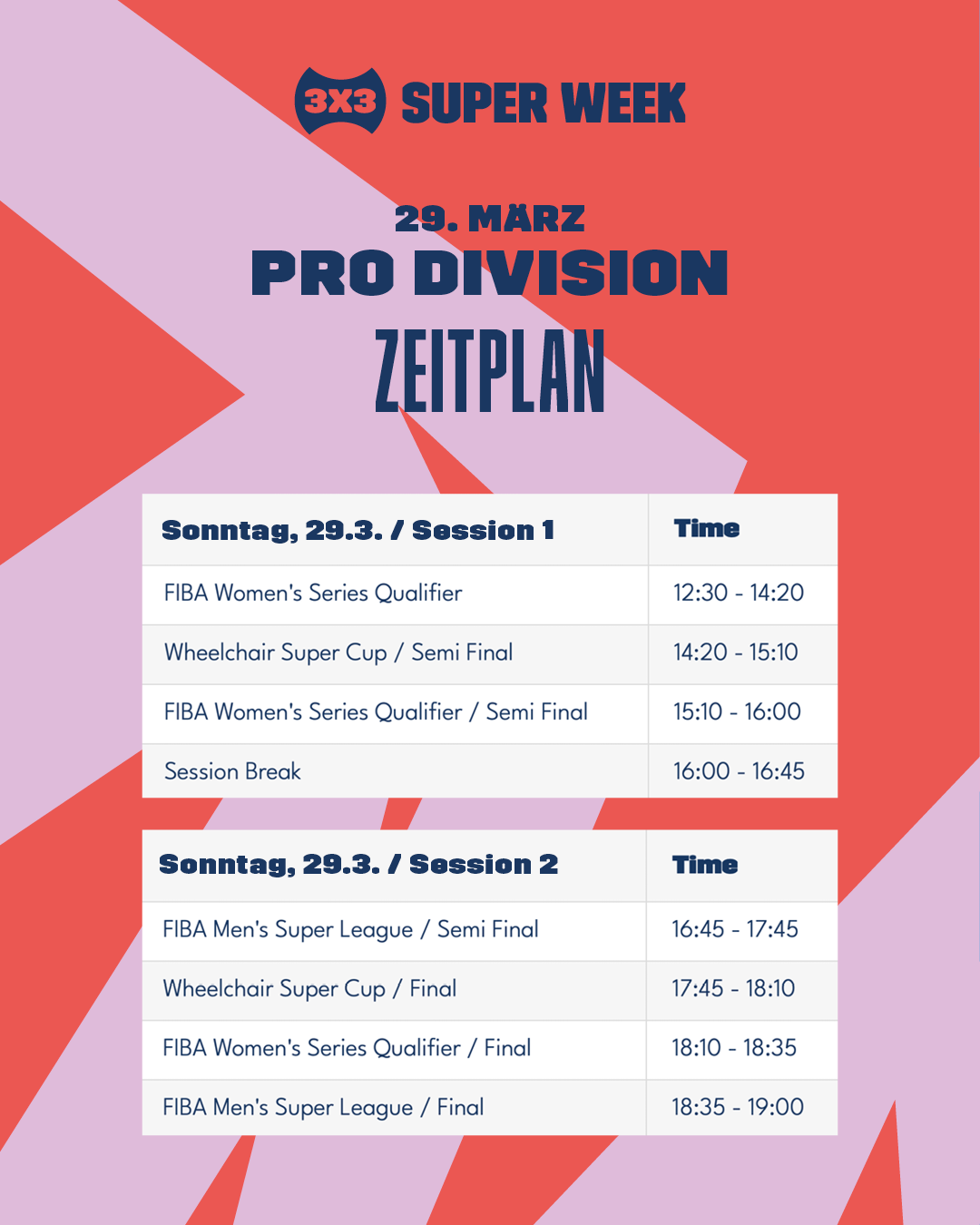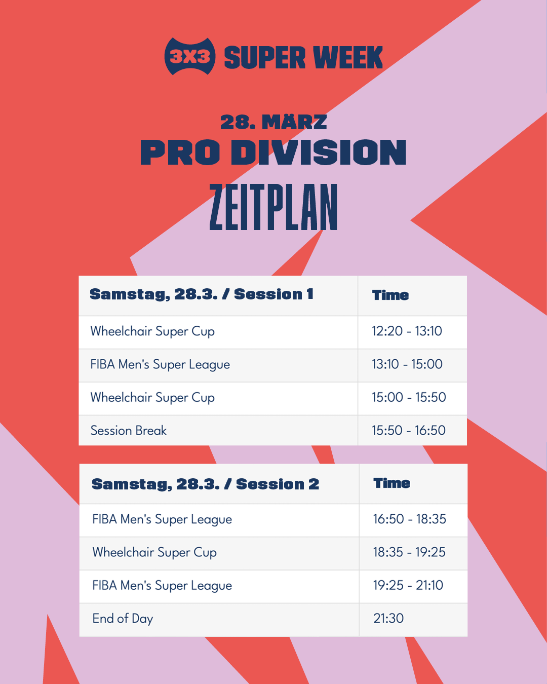 An beiden Veranstaltungstagen finden je zwei Sessions mit mehreren aufeinanderfolgenden Top-Spielen in den verschiedenen Turnierformaten in der ticketpflichtigen Pro Division statt: Am Samstag von 12:20 Uhr bis 15:50 Uhr & 16:50 Uhr bis 21:10 Uhr in den Turnierformaten FIBA Men’s Super League und Wheelchair Super Cup.